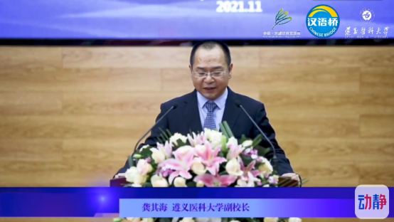 中国-东盟教育交流周组委会秘书处执行秘书长刘宝利先生、中外语言交流合作中心党委副书记宋永波先生、泰王国驻昆明总领馆总领事孟功先生、贵州省教育厅党组成员、省教育厅工会主席王慧女士、贵州省外事办公室党组成员、省对外友协专职副会长蒋红女士等嘉宾线上出席了此次大赛并致辞。我校党委副书记、校长刘建国致欢迎辞,副校长龚其海主持开幕式。
